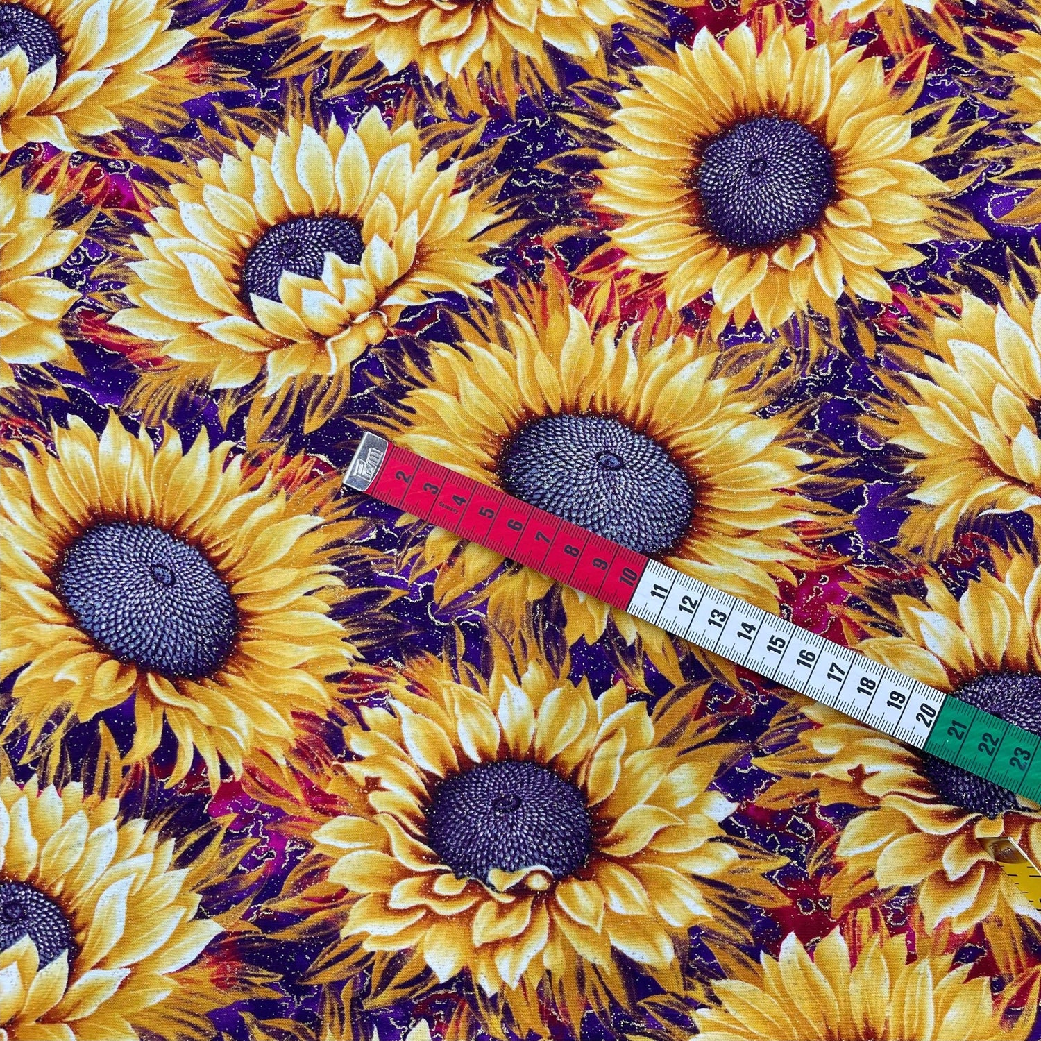Brighten up your sewing with the Here Comes the Sun – Large Sunflowers fabric by Benartex. This 100% cotton quilting fabric features bold, golden-yellow sunflowers accented with shimmering gold metallic highlights on a rich amethyst background. Perfect for quilts, patchwork, home décor, and apparel, this fabric brings warmth, vibrancy, and natural beauty to your projects.