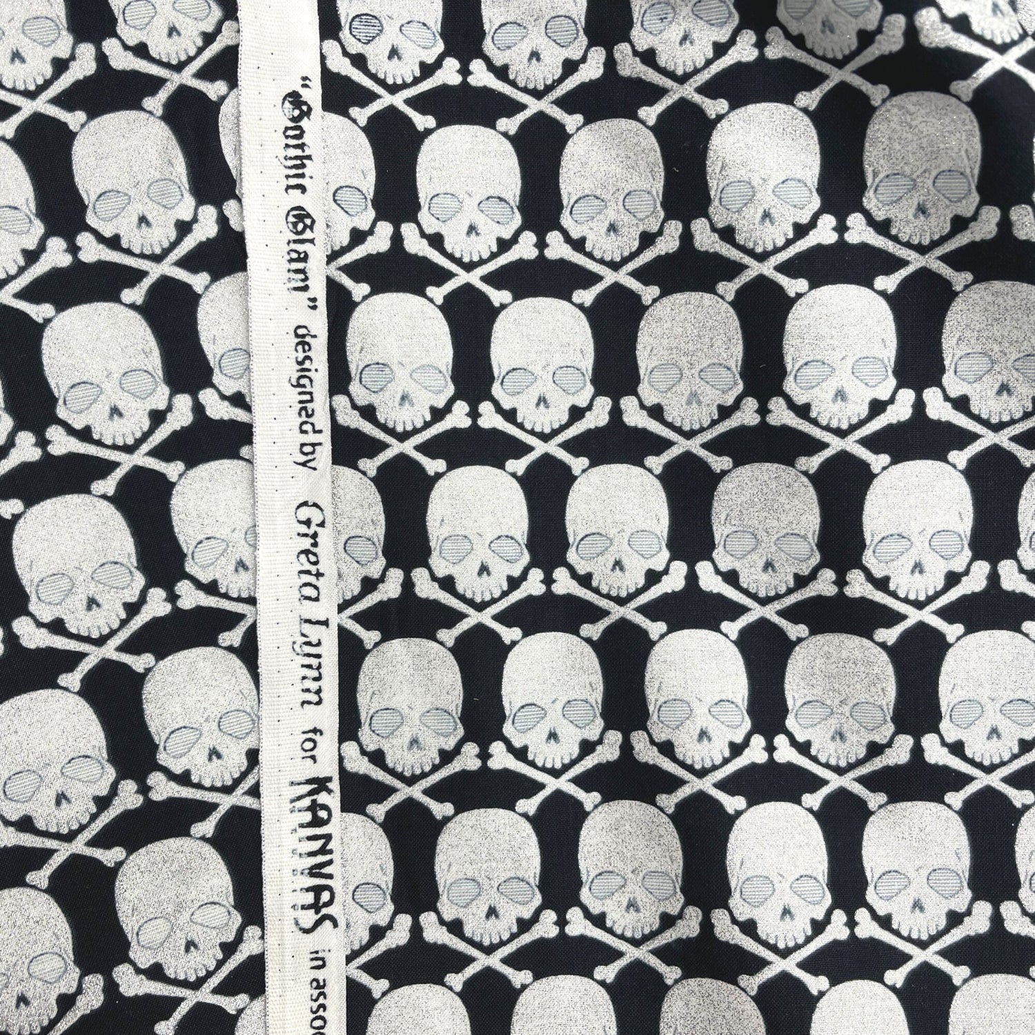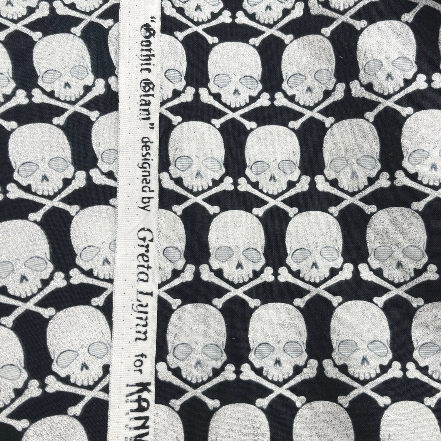 Add a touch of edgy elegance to your sewing with the Skulls Metallic fabric from the Gothic Glam collection by Greta Lynn for Benartex. This 100% cotton quilting fabric features bold skull motifs highlighted with shimmering silver metallic accents on a deep black background. Perfect for Halloween quilts, gothic décor, costumes, and statement projects.