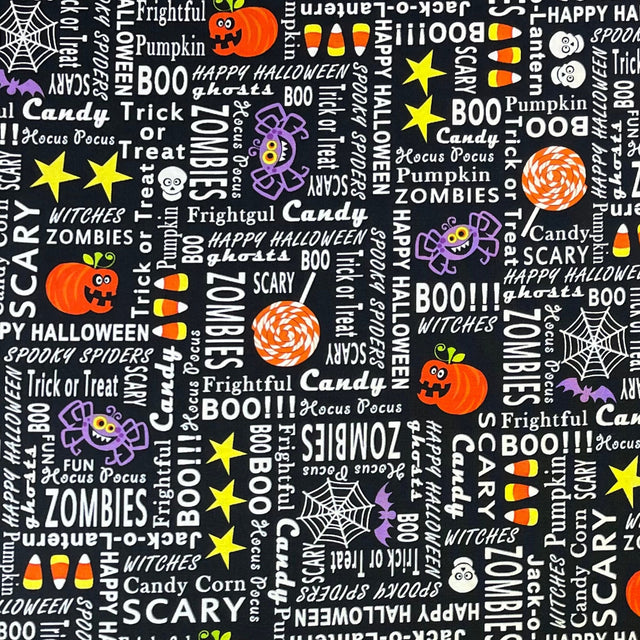 Spice up your spooky season with Frightful & Delightful Halloween Words by First Blush Studio! Featuring bold words, zombies, pumpkins, and spooky icons on black cotton, this playful print is perfect for Halloween quilts, décor, and treat bags.