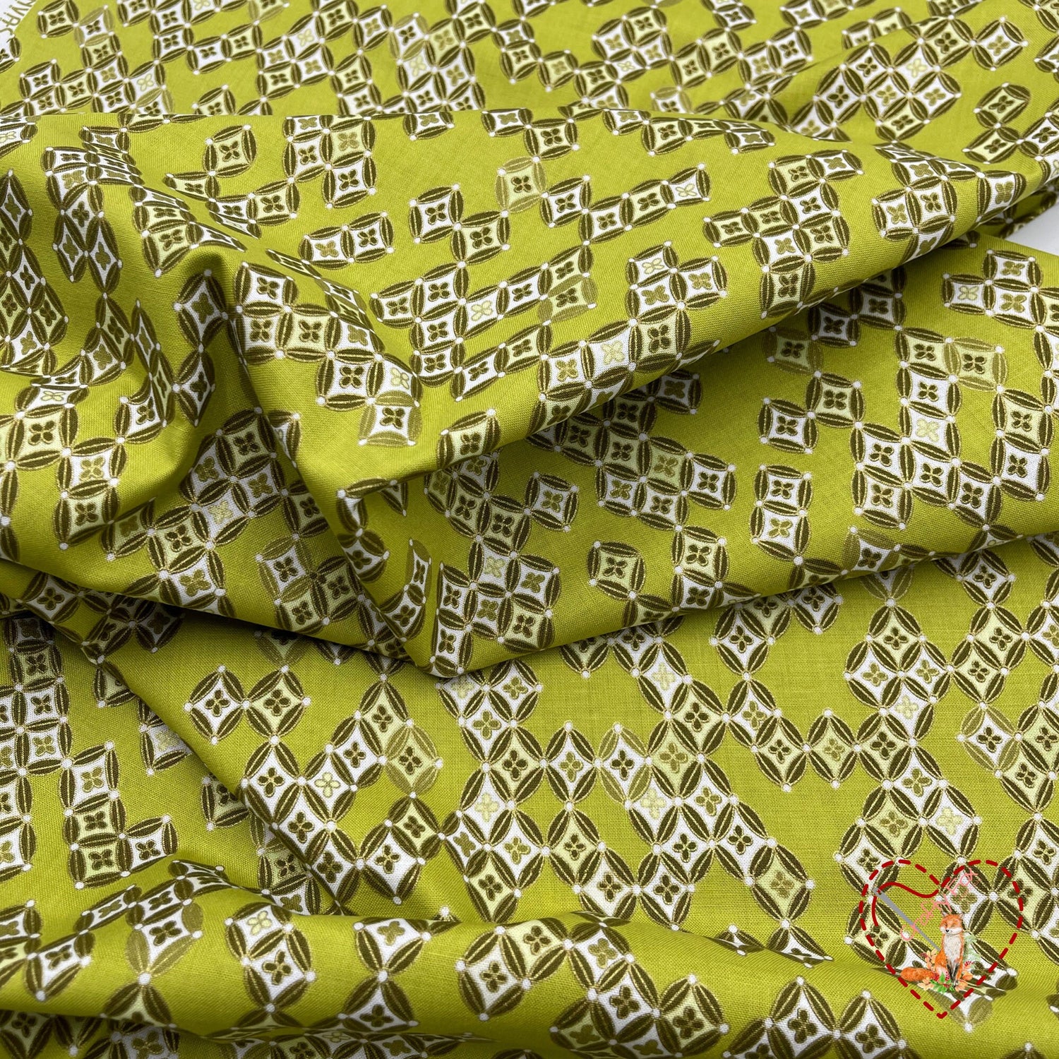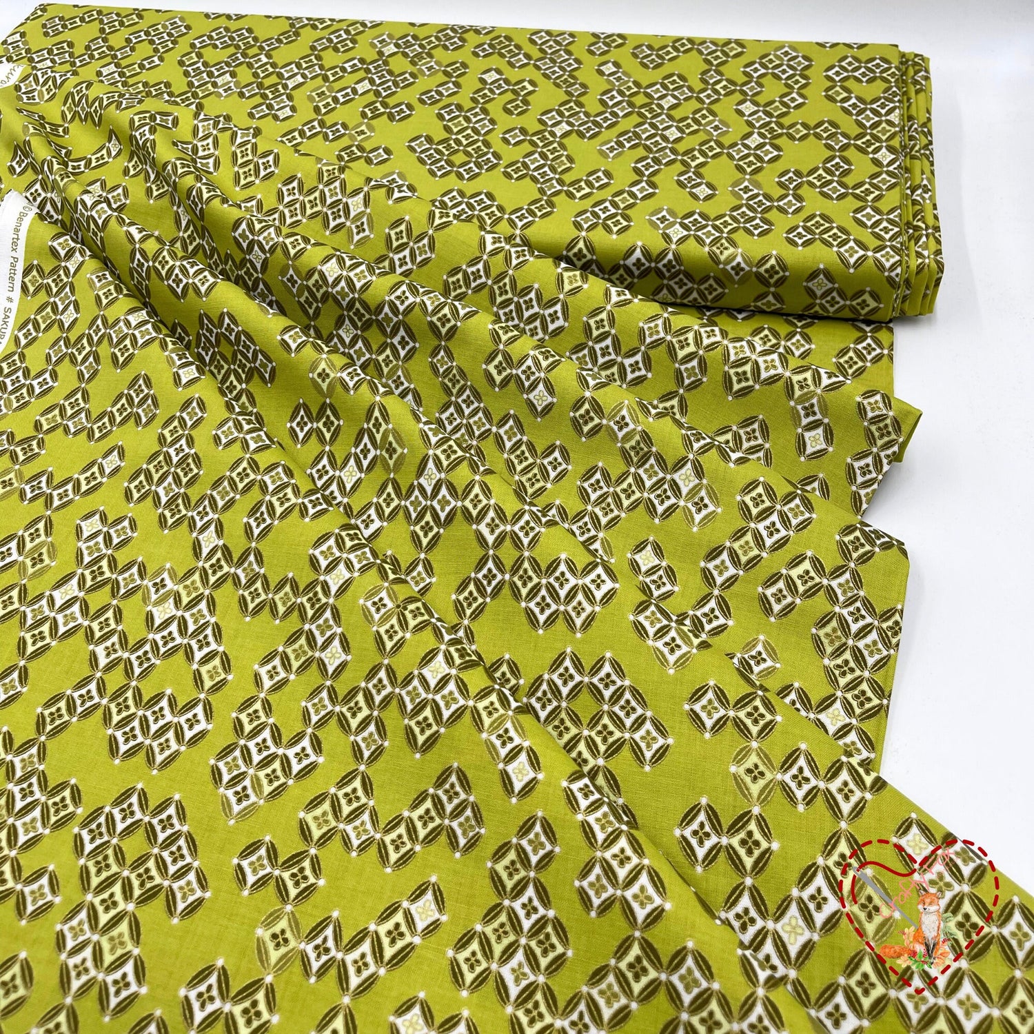 Sakura Japanese Geisha Fabric – Lime Green Diamonds with Gold Metallic Accents | Benartex BT6277.44