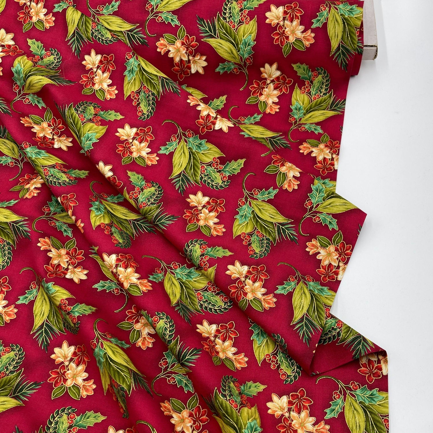 Christmas Splendor Holly Floral Red Fabric with Gold Metallic Accents – Henry Glass HG8322M.88