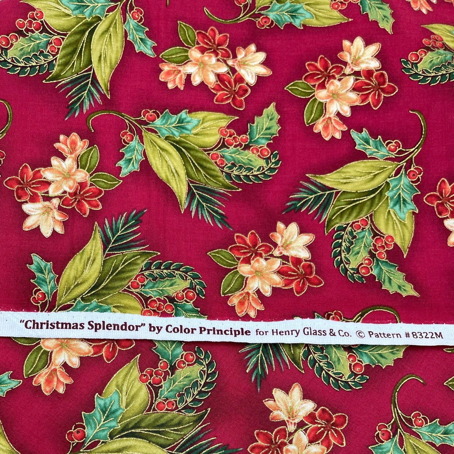 Christmas Splendor Holly Floral Red Fabric with Gold Metallic Accents – Henry Glass HG8322M.88 - 1/2 Yard (18"x44") is backordered and will ship as soon as it is back in stock.