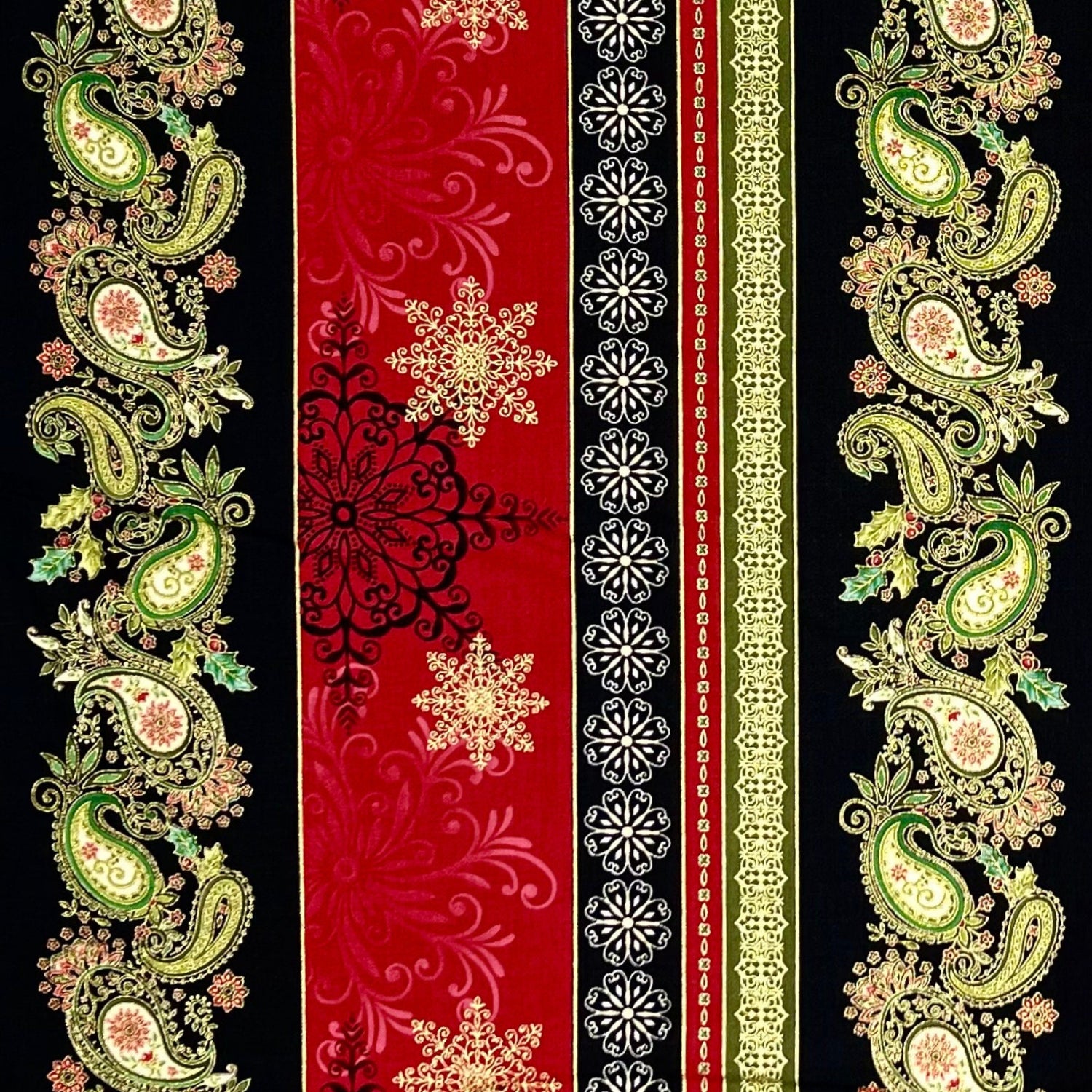 Bring festive elegance to your quilting with Winter Garden Paisley Border Fabric by Henry Glass. Designed by Color Principle, this 100% cotton quilting fabric features intricate paisley borders highlighted with shimmering metallic gold accents. Perfect for Christmas quilts, table runners, and holiday décor.