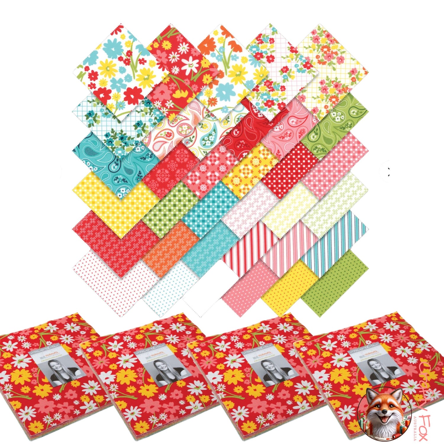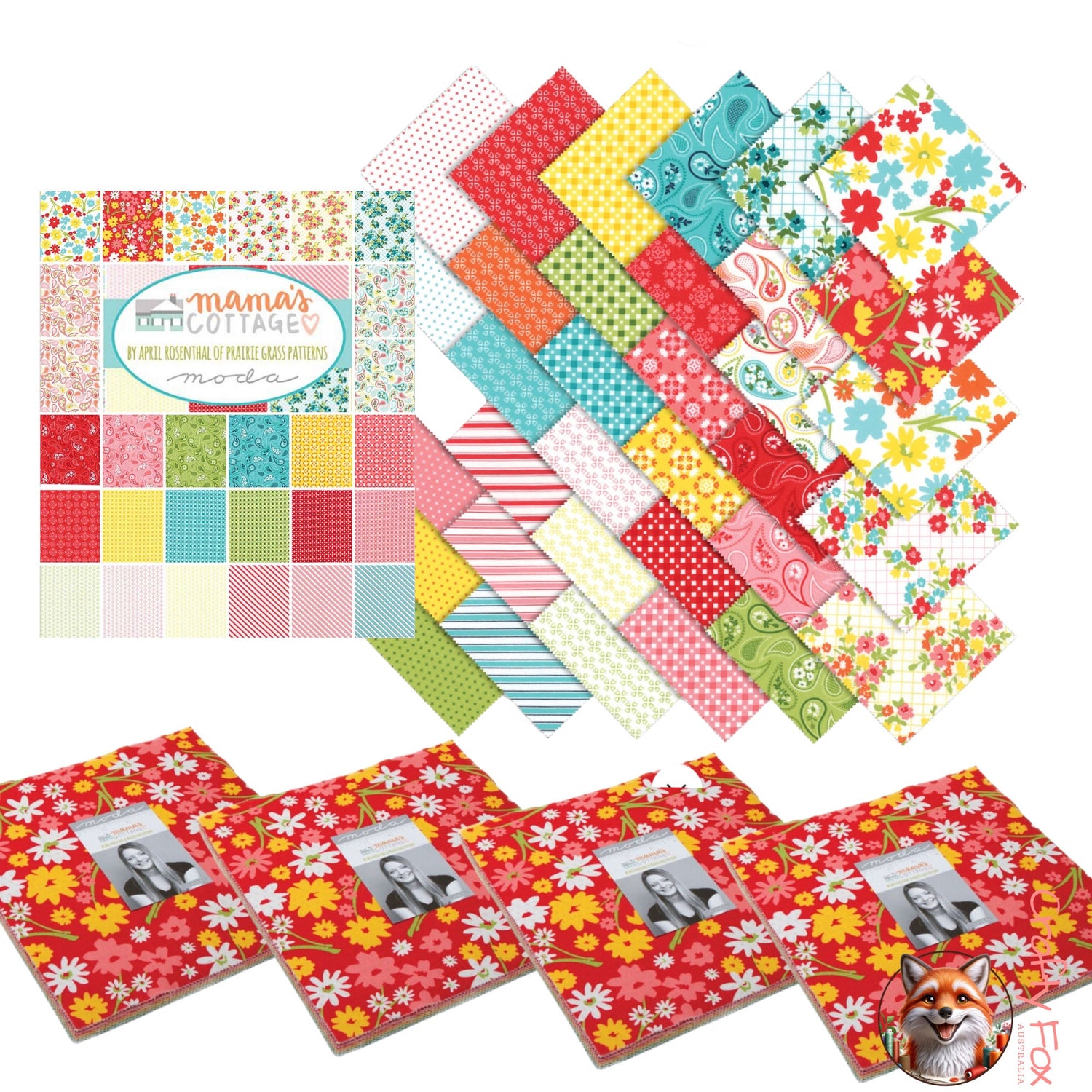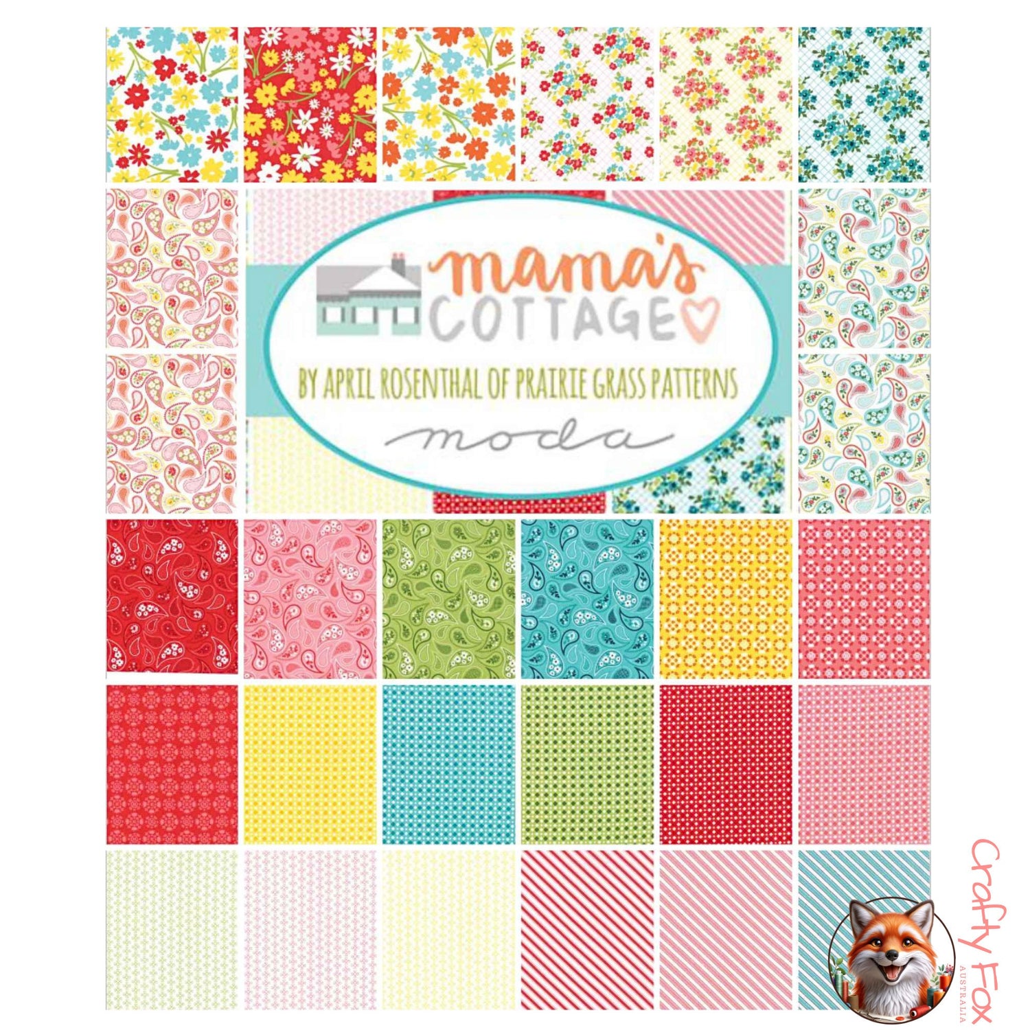 Discover the charm and versatility of the Mama’s Cottage Layer Cake by April Rosenthal of Prairie Grass Patterns for Moda Fabrics. This pre-cut collection includes 42 premium cotton squares, each measuring 10" x 10" (25.4cm x 25.4cm), featuring a mix of vibrant colours and playful patterns that capture the warmth and coziness of Mama’s Cottage.