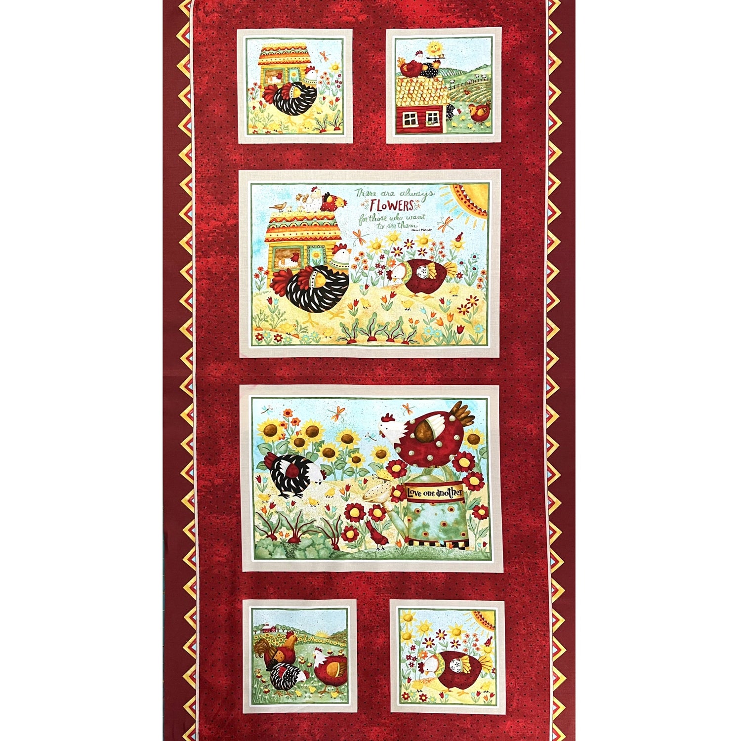Bring a touch of rustic charm to your sewing projects with the Country Charm Red Rooster fabric panel from the All Cooped Up collection by Debi Hron for Henry Glass. Featuring cheerful roosters and cozy countryside scenes, this 100% cotton panel captures the warmth and simplicity of farm life.