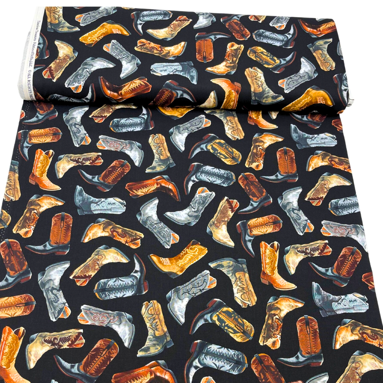 Channel classic Wild Wild West style with Cowboy Boots Black Cotton Quilting Fabric by Timeless Treasures. This bold Western print features detailed cowboy boots measuring approximately 3 inches (7.62cm) high, set against a striking black background for a dramatic, vintage-inspired look.