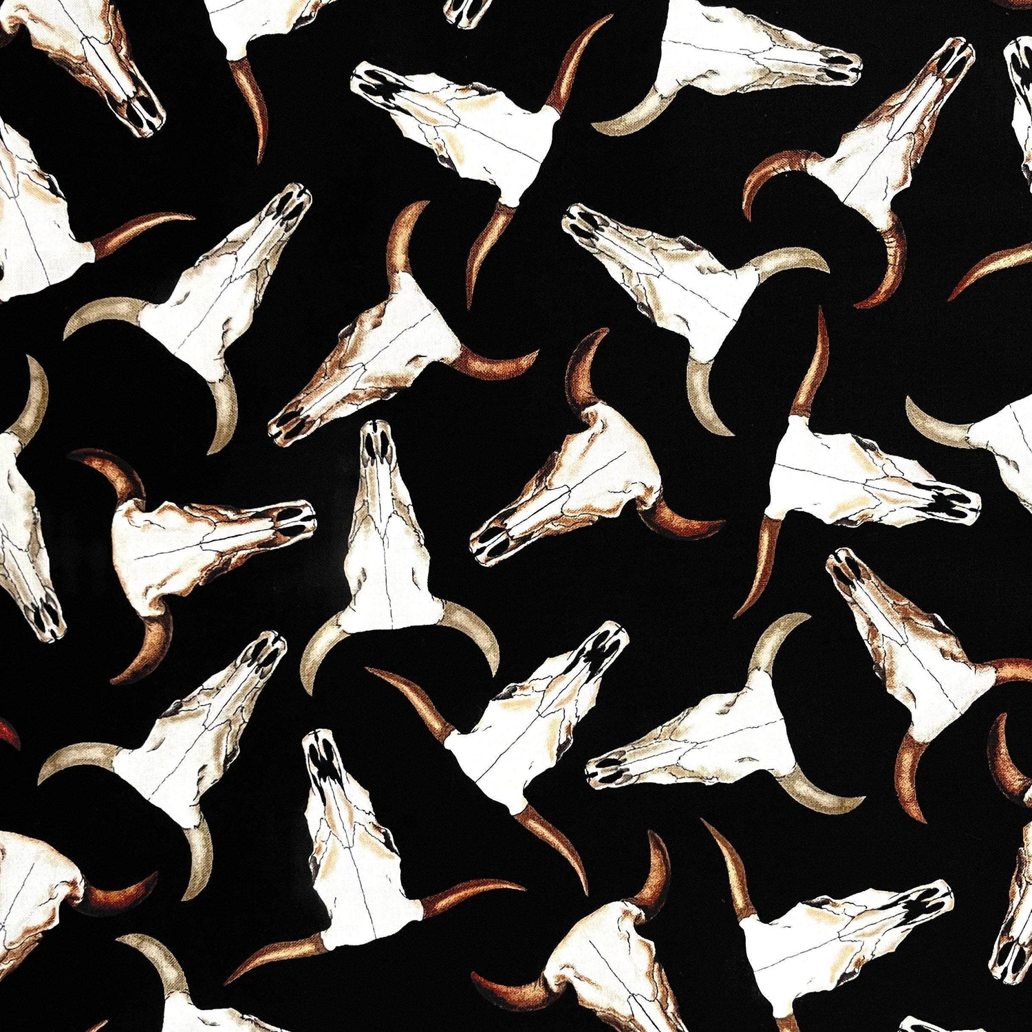 Embrace the rugged spirit of the American West with West Buffalo Longhorn Skulls Cotton Fabric by Timeless Treasures. This bold and striking design features iconic buffalo longhorn skulls, bringing raw Western charm and rustic character to your sewing projects.