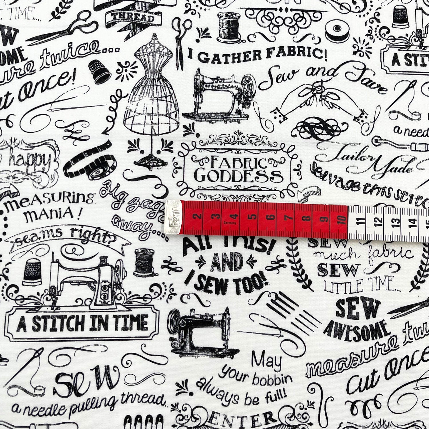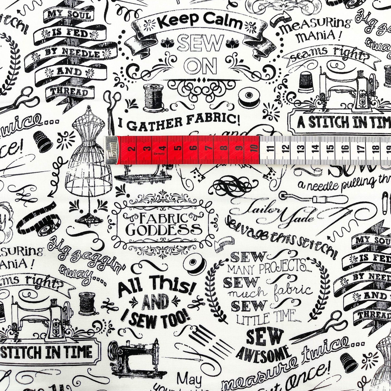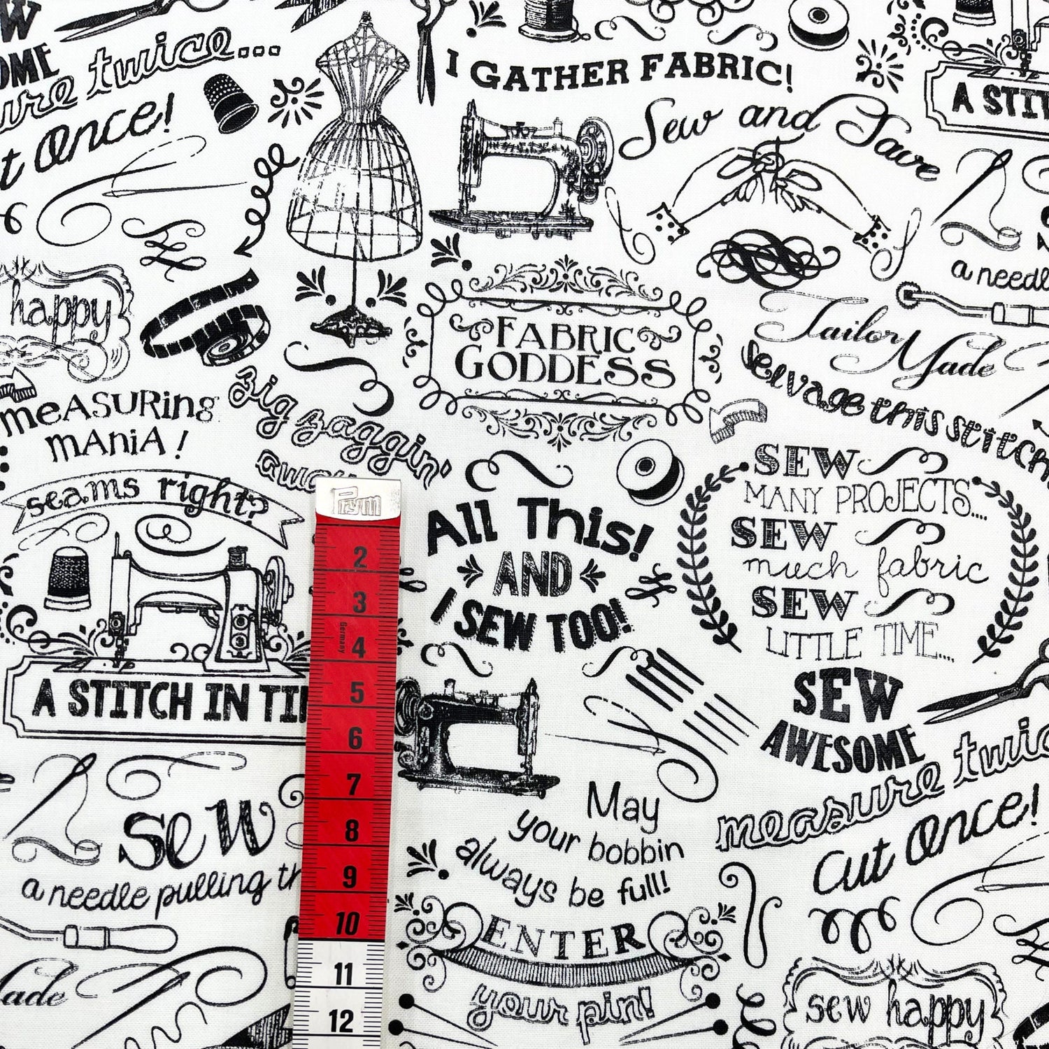 Celebrate your passion for sewing with the Gail Sewing Words fabric by Timeless Treasures. This rare and playful 100% cotton quilting fabric features bold black-and-white text prints with fun phrases like “Sew Fun” and “FABRIC GODDESS”. Perfect for fabric lovers, quilters, and crafters, this Fat Quarter is ideal for small projects, patchwork, or adding a quirky touch to your fabric stash.