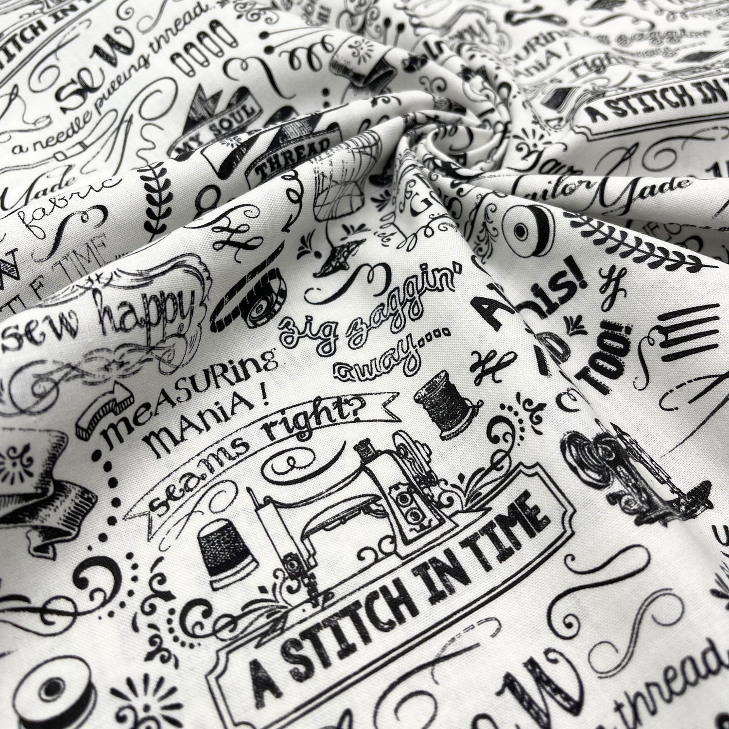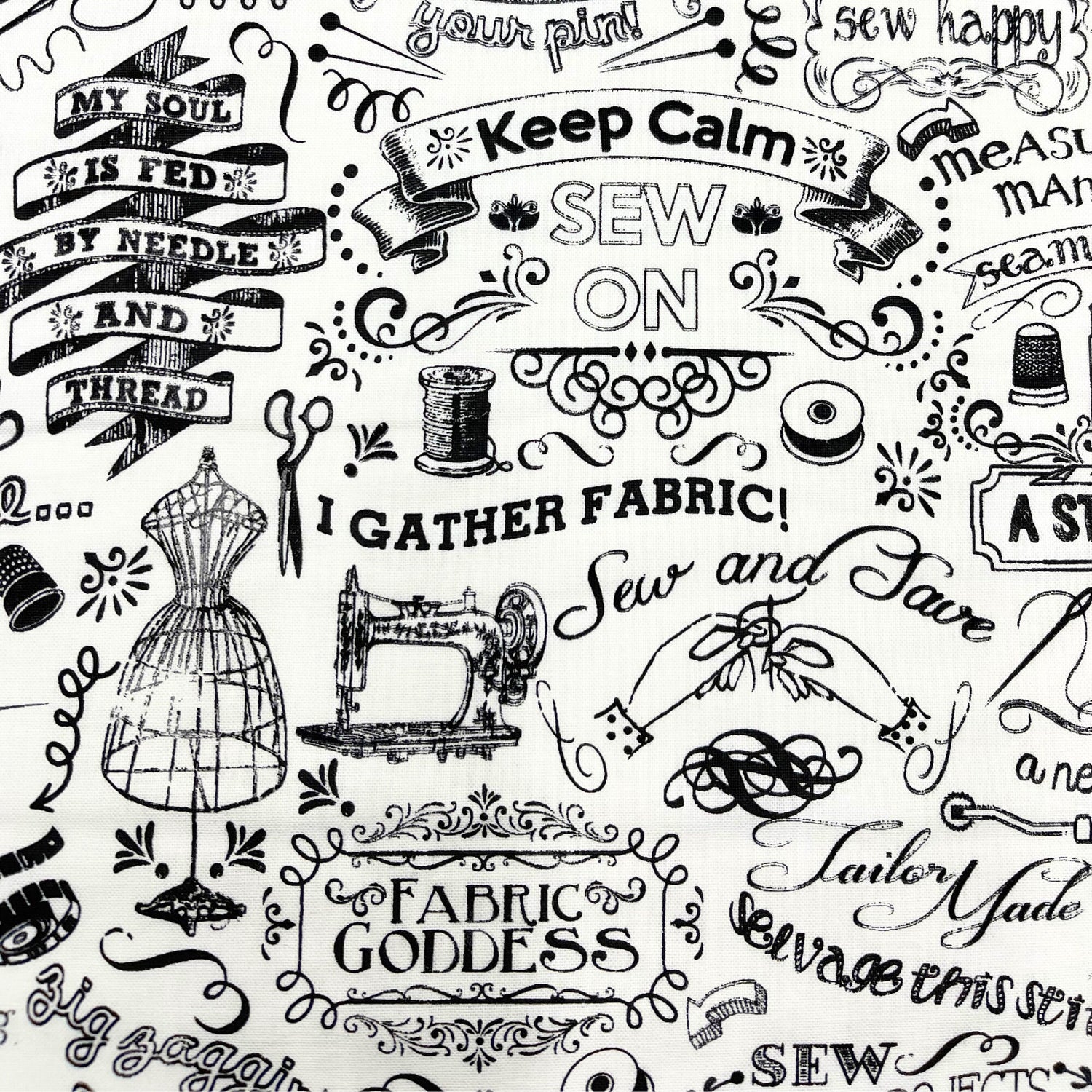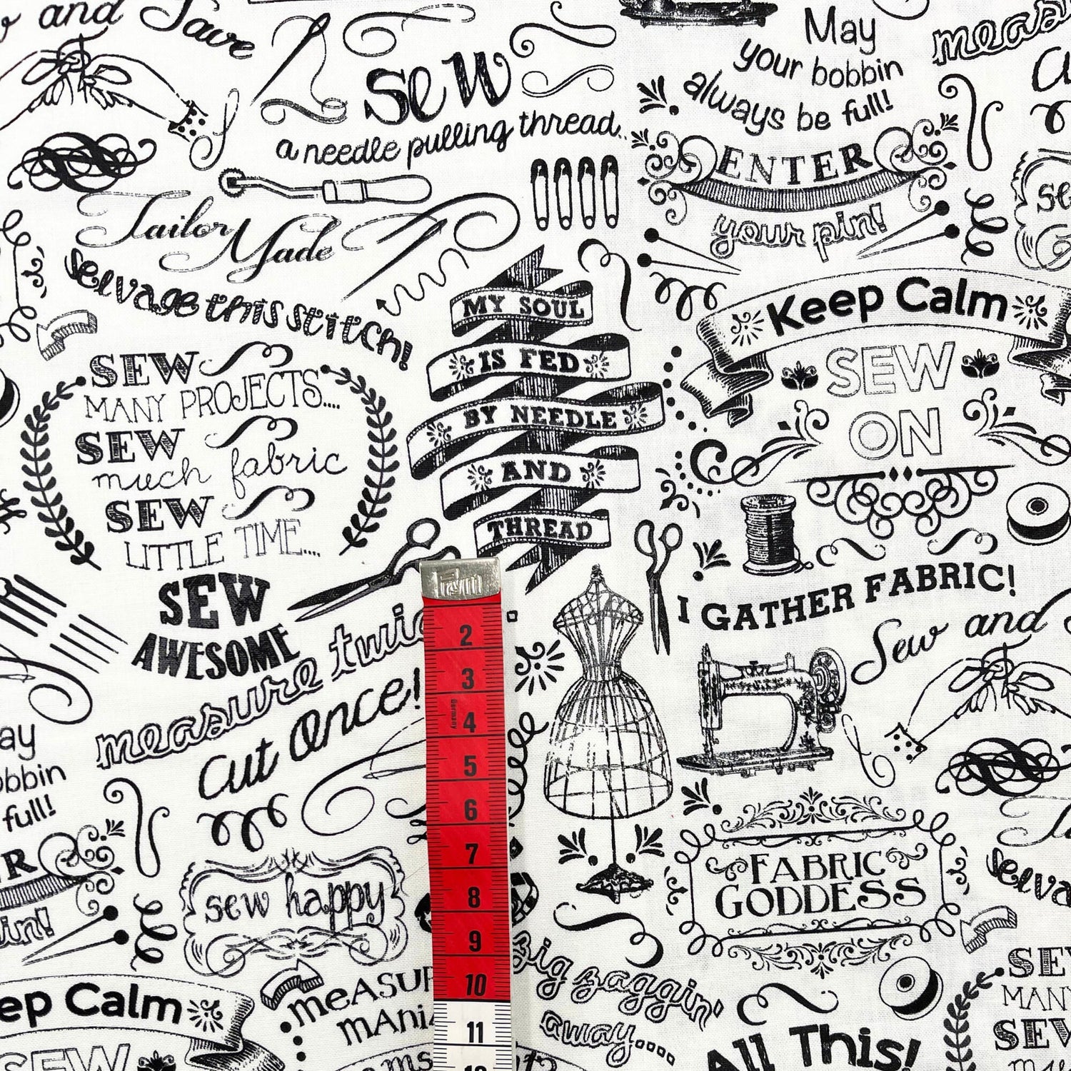Celebrate your passion for sewing with the Gail Sewing Words fabric by Timeless Treasures. This rare and playful 100% cotton quilting fabric features bold black-and-white text prints with fun phrases like “Sew Fun” and “FABRIC GODDESS”. Perfect for fabric lovers, quilters, and crafters, this Fat Quarter is ideal for small projects, patchwork, or adding a quirky touch to your fabric stash.