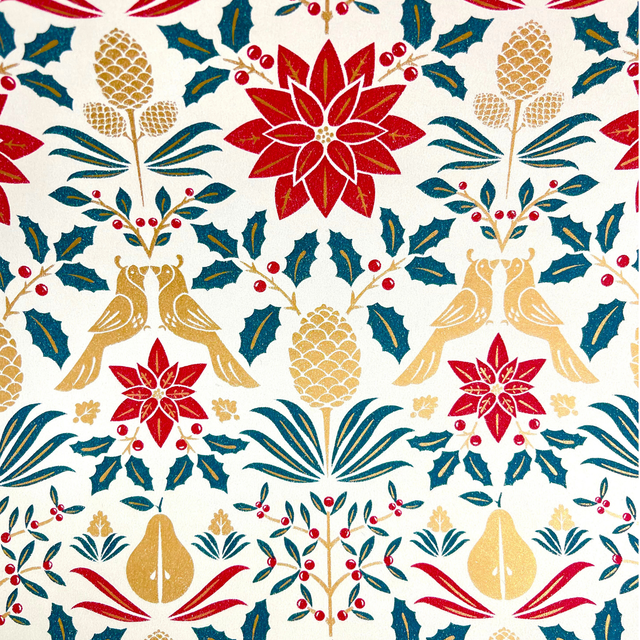 Wrap your gifts in classic holiday beauty with the Poinsettia Gift Wrapping Paper. Featuring elegant red poinsettias, gold embellishments, turtle doves, golden pears, partridges, and festive holly on a soft cream background, this luxurious 80gsm uncoated paper brings timeless charm to your Christmas celebrations.